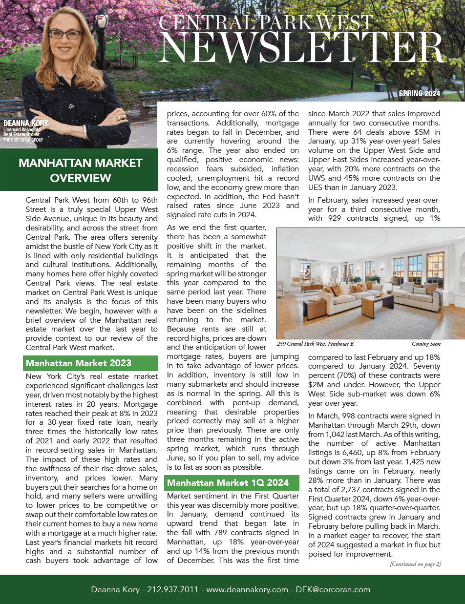 In this newsletter we provide an overview of the Manhattan Market, a Central Park West Market snapshot, an analysis of the luxury market on Central Park West, and advice for sellers on what to expect this spring.