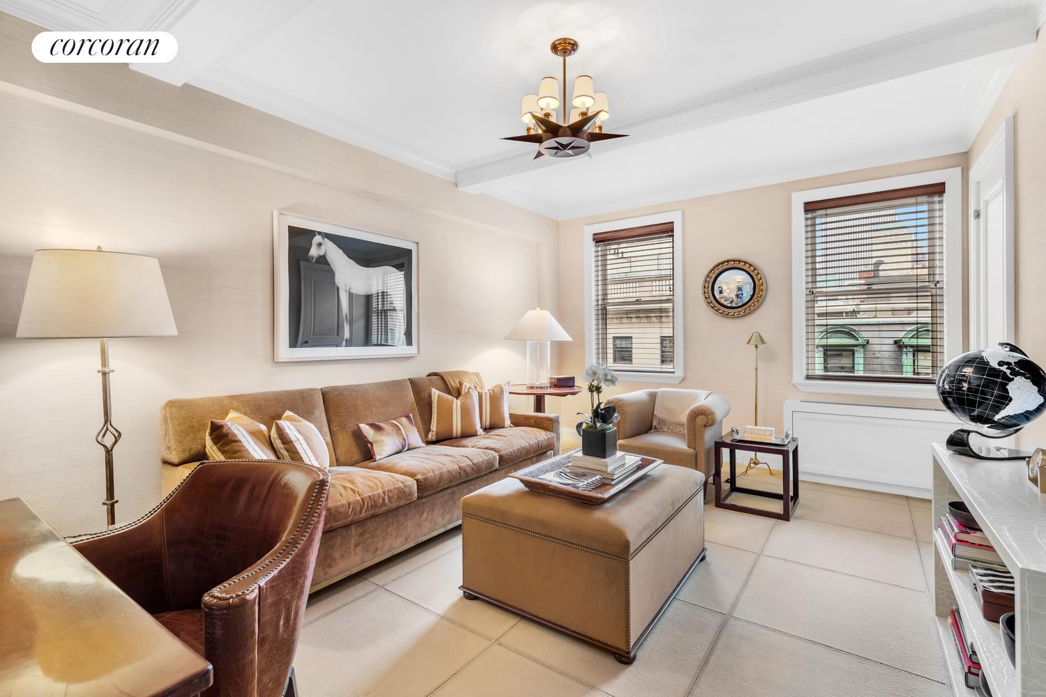 Apartment 6/7A at 3 East 69th Street is a sun-filled, expansive, and elegant 8-room duplex on the Upper East Side's 'Gold Coast', on one of the prettiest blocks a half block from Central Park. This high-floor, three-bedroom + library, three-and-a-half-bathroom home with approximately 3,100 square feet, has a gracious and flexible layout with views of the gorgeous townhouse block, as well as the Manhattan skyline and oblique views of Central Park. This stunning combination home was beautifully designed to create a townhouse-like feel in a full-service building with a fabulous separation between formal entertaining and private living. The grand and gracious layout offers flexibility for work from home and guest options with two, bedroom suites upstairs and one suite plus a library with floor-to-ceiling custom bookshelves and home office downstairs. There is a bounty of natural light streaming in throughout from both south, north and east exposures and oversized windows on both floors.